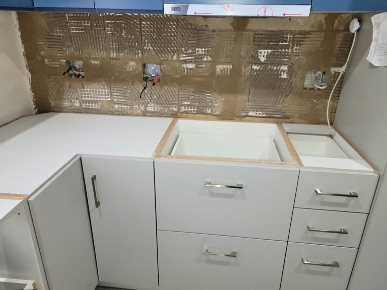 The two-tone cabinetry in soft grey and deep blue adds modern character, making the kitchen feel larger, lighter, and more practical — proof that thoughtful design and precision workmanship can deliver remarkable results, even in smaller renovations.